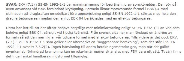1) Metoden i EN 1992-1-1 7.3.4 är i första hand avsedd för beräkning av sprickbredd vid armeringstöjning orsakad av last. Den är således inte lämpad för sprickor på grund av förhindrad krympning eller inre tvång, om vid temperaturökning vid härdning. För sprickor på grund av förhindrad krympning eller annan tvångsinverkan hänvisas i stället till EN 1992-3, bilaga L och M.