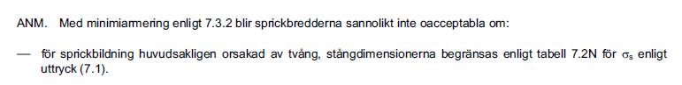 Om det finns krav på sprickbreddsbegränsning bör tillsvidare minimiarmeringsvillkoret (7.1) tillämpas med en begränsad spänning enligt tabell 7.2N. I så fall är det viktigt att justera stångdiametern enligt ekv (7.7N). I ekv (7.7N) ska för övrigt ingå en faktor k1 = 0,8 i täljaren. För att få fram aktuell spänning ska omräkningen tillämpas "baklänges", dvs man går in i tabellen med ett omräknat f*.